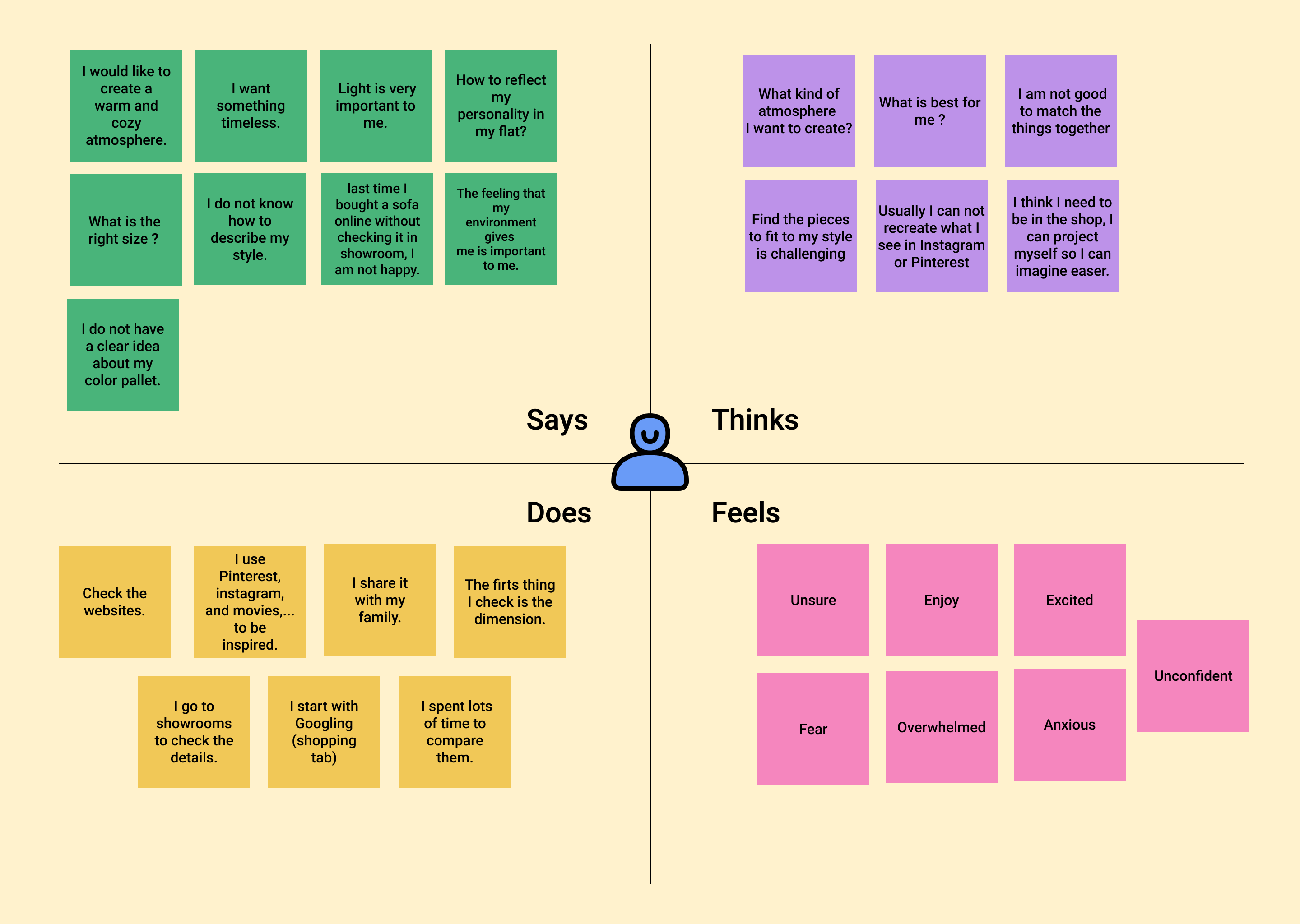 Problem statement (Customer POV): Inspirational Shoppers need a way to reassure about choosing furnitures because there is lots of choice and they do not have interior design skills and they fear making an incorrect choice that may not align with their needs and style.