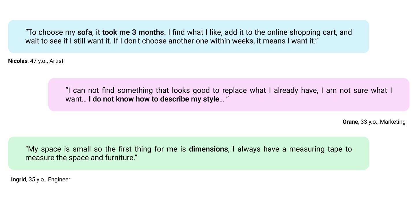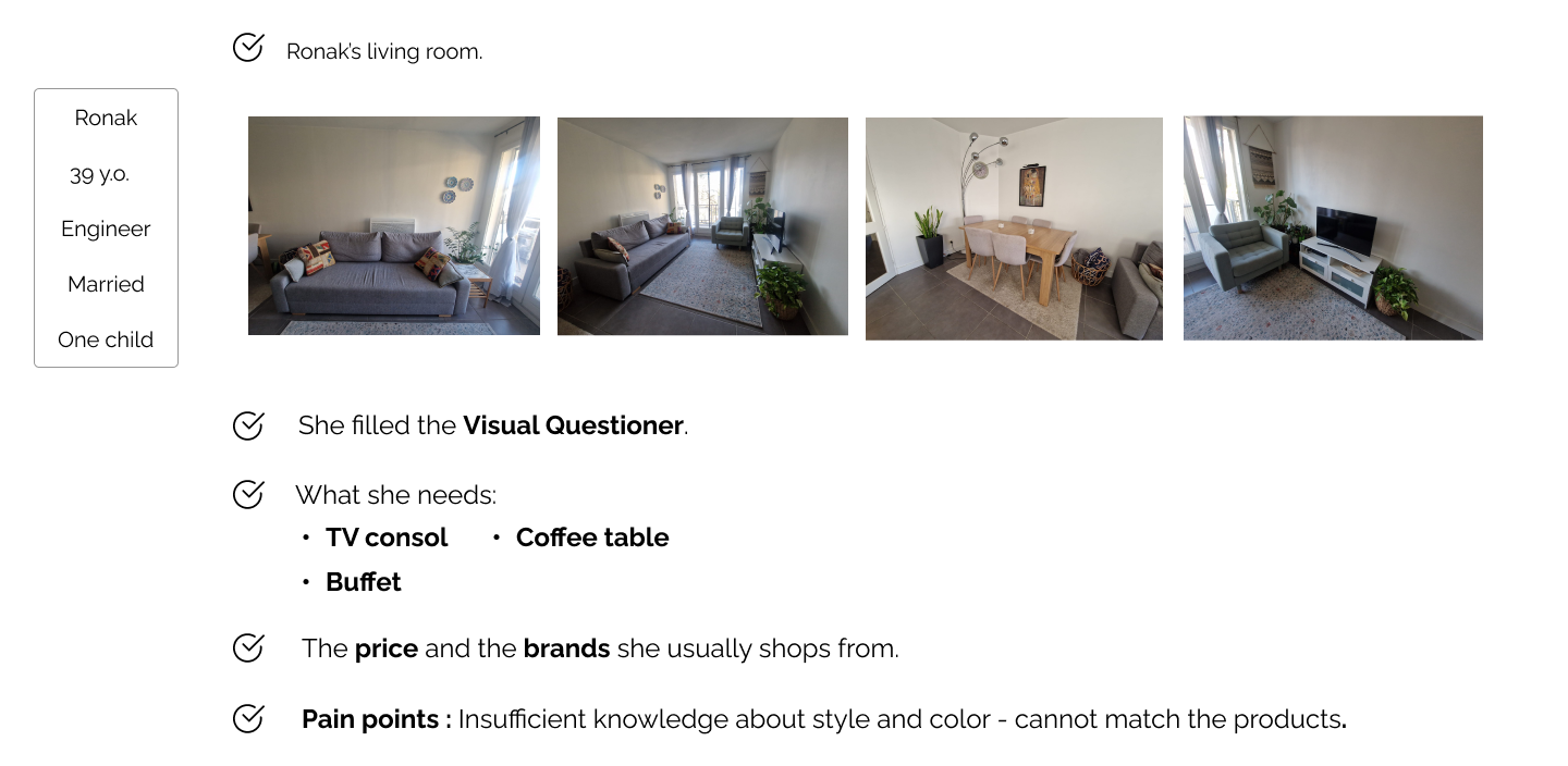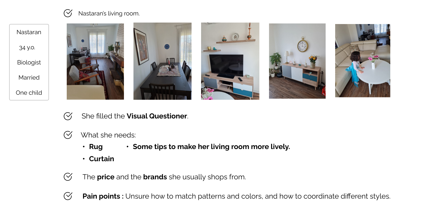 We conducted 10 semi-structured interviews with some participants through facebook groups and those one that participated in the survey. It allowed us to gain a more holistic understanding of how people think and behave want to buy new furnitures or when they want to design their home, and what their needs are..
