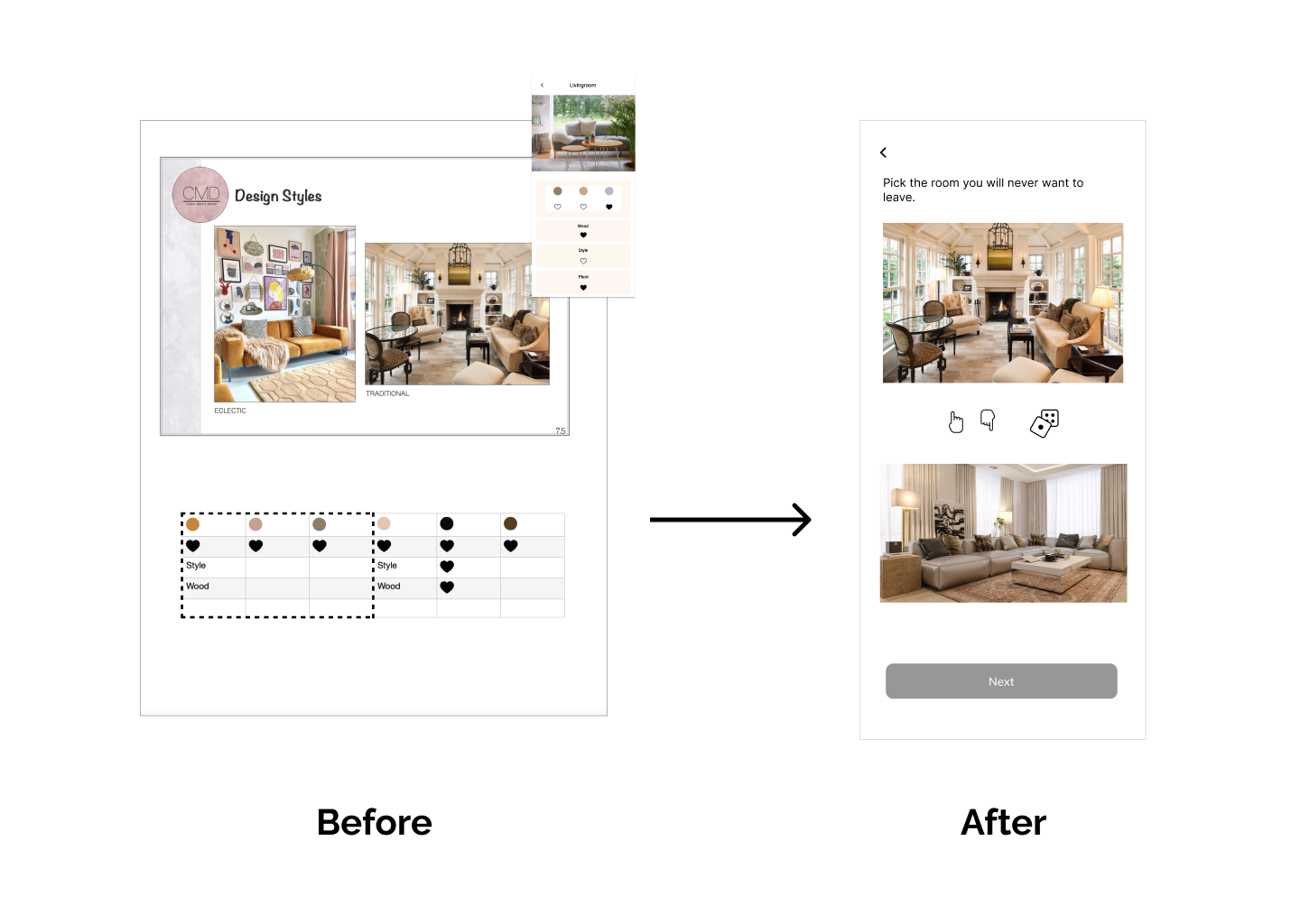 Provide an online personalised interaction through a visual questionnaire to find what kind of environment, style and color people like and match with their requirements so it provides personalized products based on the information collected from users.